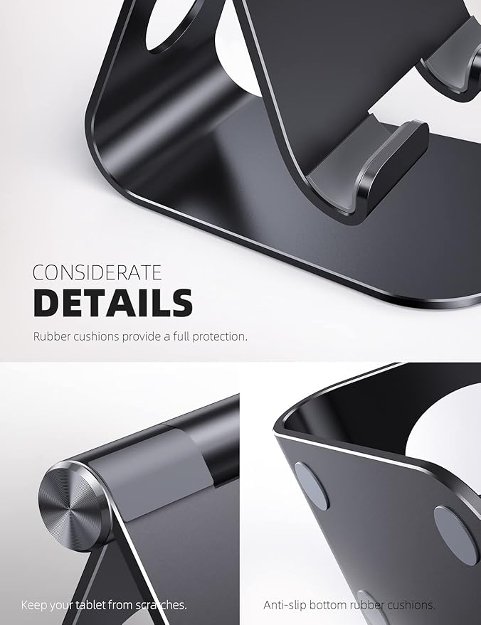 - 【STURDY CONSTRUCTION& RUBBER PADS】 Rubber pads and feet of tablet stand can protect your device from daily scratches and sliding