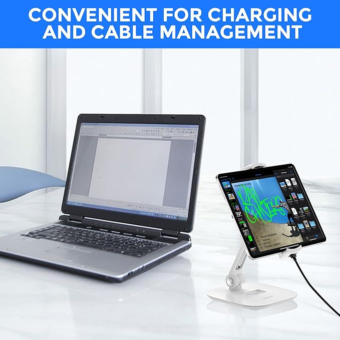 - Considerate layout – Simple and ergonomic shape echo with your sleek tech gadgets in harmony, featuring special cutouts on both the holder and the base bottom for housing power cord – a true tablet computer stand that pays great attention to details for its users