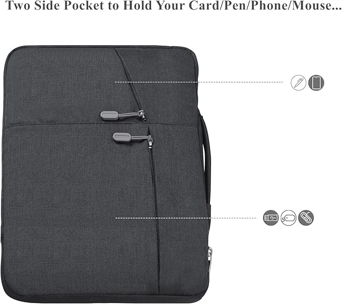 - Extra two side pockets, make it easy for you to carry mobilephone,charger, mouse, earphones, pens etc.