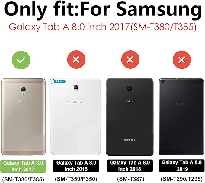 - Compatibility: Only fits Galaxy Tab A 8.0 inch [ MODEL: SM-T385/SM-T380 ] 2017 Released. DO NOT fits any other models. In order to Preserve the original touch, this tablet case is designed without built-in screen protector