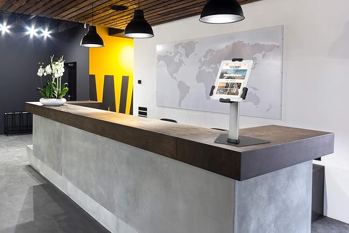 - SECURE AND THEFT-RESISTANT: Elevate the security of your iPad in any public setting with our anti-theft iPad Kiosk POS Stand. Universal tablet mount features a solid steel base with a durable lock system, complemented by a strong and stylish aluminum finish. Predrilled holes in the base facilitate a secure installation on desks or countertops, and the key and lock mechanism ensures that your iPad stays securely enclosed within the kiosk, offering both functionality and robust security.