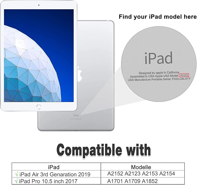 - Compatibility: Only fit for Apple iPad Air 3rd Generation 10.5 Inch 2019 relesed Tablet [Model:A2152/A2123/A2153/A2154] and iPad Pro 10.5 Inch 2017 relesed Tablet[Model:A1701/A1709]. ⚠ BUT Apple Pencil is not included&Screen protector. Built-in Pencil holder for Pen securely carrying,