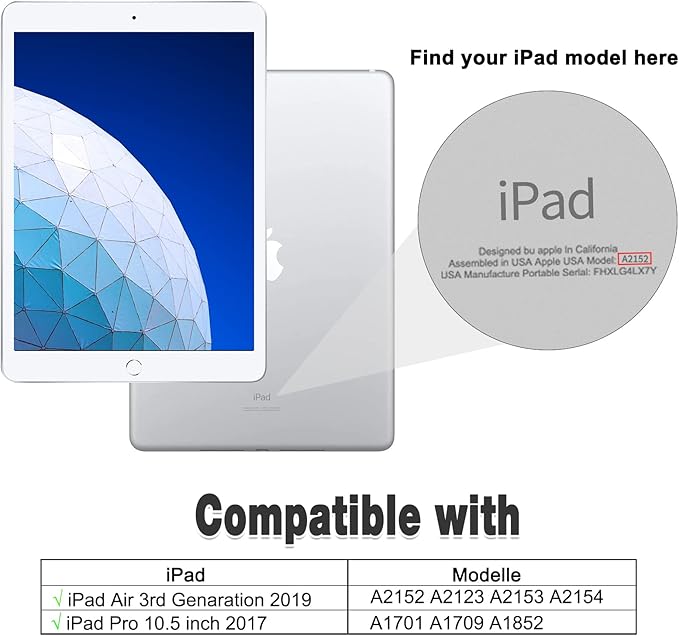 - Compatibility: Only fit for Apple iPad Air 3rd Generation 10.5 Inch 2019 relesed Tablet [Model:A2152/A2123/A2153/A2154] and iPad Pro 10.5 Inch 2017 relesed Tablet[Model:A1701/A1709]. (2) Built-in Pencil holder for Pen securely carrying, Not Included Screen Protector and Apple Pencil.