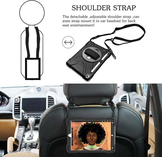 - Adjustable Shoulder Strap: By attaching strap to any two corners and adjusting to a comfortable length,your tablet can be carried vertically or horizontally in a more secure way during hiking, traveling or other outdoor activities. Also, strap allows you to hang up your tablet behind car seat for iPad entertainment for kids.