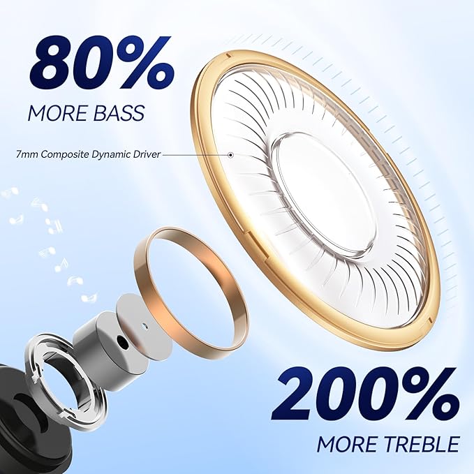 - More Bass & High-Quality Stereo Sound. Powered by 7mm composite dynamic drivers, the wireless earbuds present a powerful, balanced and wide sound range with deep bass, stunning treble and clear mid, connecting you with the music world.