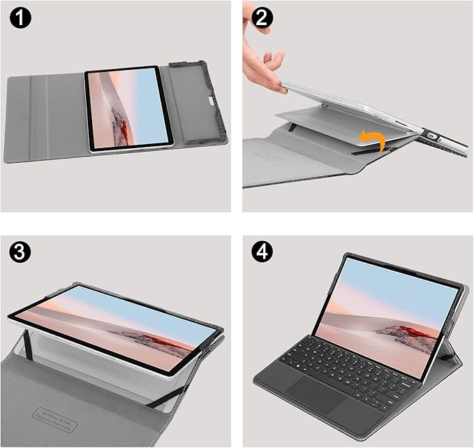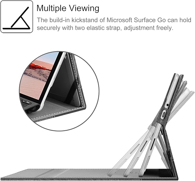 - Unique design ensures Microsoft Surface Go original built-in kickstand to be used at will for multi-viewing angles. Extra Pocket allows to store small items such as business card or usb charging cable if in need.