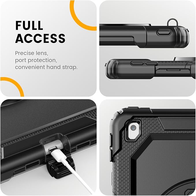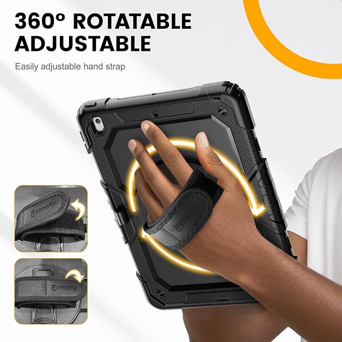 Timecity Case for iPad 9th/ 8th/ 7th Generation 10.2 inch - Heavy Duty Protective Cover with Screen Protector, Rotating Stand, Shoulder Strap & Pencil Holder | Kids-Friendly (Black)