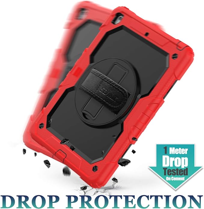 SEYMAC stock Case for iPad 9th/ 8th/ 7th Generation 10.2'', Shockproof with Screen Protector, Pencil Holder [360° Rotating Hand Strap] & Stand, for iPad 10.2 inch 2021-2019 (SiliconeRed+Black)