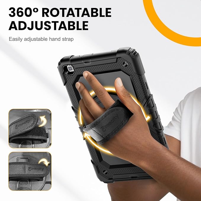 - [360° Rotatable Stand & Hand Strap & Convenient Pencil Holder] 360°Rotatable foldable stand offers multiple angles for enjoying the most comfortable keyboard-typing and movie-viewing. The 360°Rotatable adjustable hand strap makes you hold or use your tablet easily in all directions. Designed with a pencil holder, you will always avoid the trouble finding your pen. (S pen is not included.)