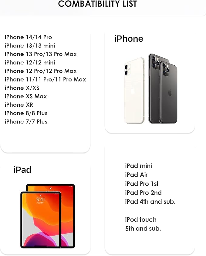 - Compatibility List – iPhone 14, iPhone 14 Pro, iPhone 13, iPhone 13 Mini, iPhone 13 Pro, iPhone 13 Pro Max,iPhone 12, iPhone 12 Mini, iPhone 12 Pro, iPhone 12 Pro Max, iPhone 11, iPhone 11 Pro, iPhone 11 Pro Max, iPhone X, iPhone XS, iPhone XS Max, iPhone XR, iPhone 8, iPhone 8 Plus, iPhone 7, iPhone 7 Plus, iPad or iPod touch with lightning port