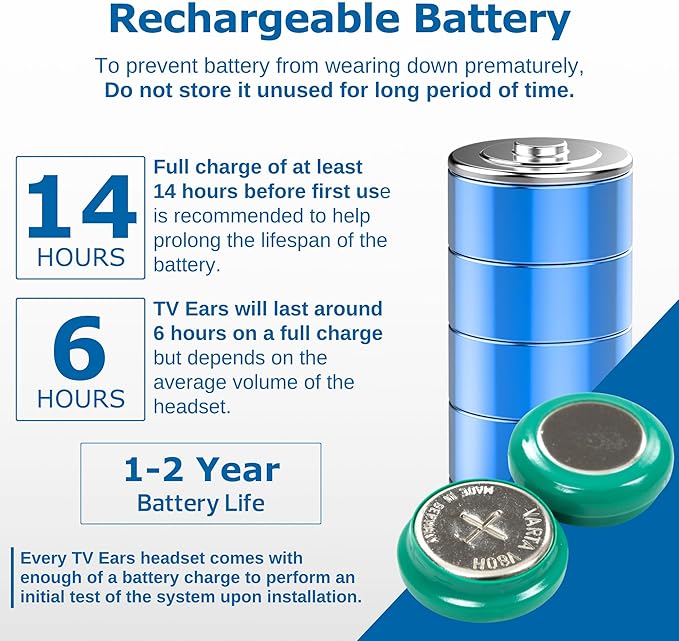 - PERSONALIZED AUDIO: Our wireless TV headsets for seniors is your personalized audio that prevents TV volume disputes. Follow key charging tips for prolonged battery life. Enjoy up to 6 hours of use per full charge of TV Ears Genuine replacement batteries.