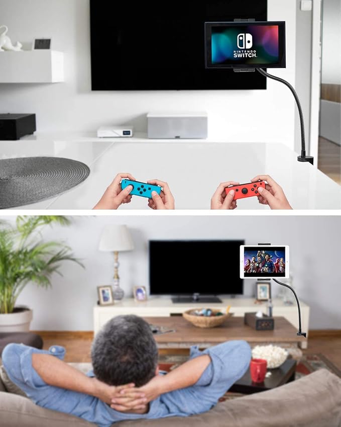 - 【Protects Eyesight And Reduces Neck Strain】With this flexible metal lazy arm tablet phone holder, you can keep your device at the right distance from your eyes, effectively fix your posture and protect your eyesight and neck. This long arm holder can also be attached to the bed. When adjusting the position, you can bend the gooseneck arm with both hands and freely adjust it to the optimum viewing angle. Fully release your hands so that you can lie comfortably on your bed or sofa.