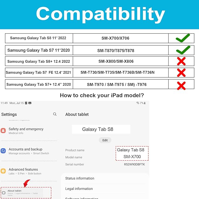 - COMPATIBILITY: Compatible with Samsung Galaxy Tab S8 11 inch 2022(SM-X700/X706)& Tab S7 11 inch 2020 Released (Model:SM-T870/T875/T878). Please confirm your model before purchasing