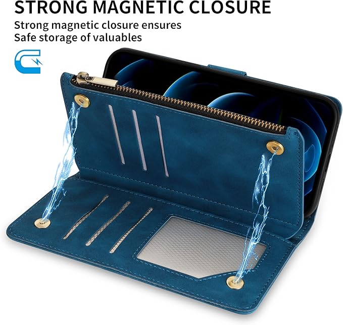 ZZXX for iPhone 12 Case Wallet with Card Slot Premium Soft PU Leather Zipper Flip Folio Wallet with Wrist Strap Kickstand Protective for iPhone 12 (Blue 6.1 inch)