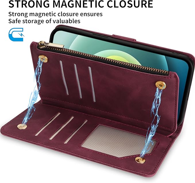 ZZXX for iPhone 12 Mini Wallet Case with Card Slot Premium Soft PU Leather Zipper Flip Folio Wallet with Wrist Strap Kickstand Protective for iPhone 12 Mini Case Wallet(Wine Red 5.4 inch)