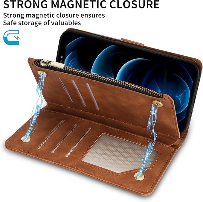 ZZXX for iPhone 12 Pro Max Wallet Case with Card Slot Premium Soft PU Leather Zipper Flip Folio Wallet with Wrist Strap Kickstand Protective for iPhone 12 Pro Max Case Wallet(Brown 6.7 inch)
