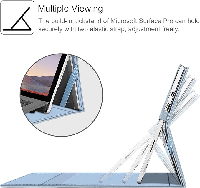 - Unique design ensures Microsoft Surface Pro original built-in kickstand to be used at will for multi-viewing angles. Extra Pocket allows to store small items such as business card or usb charging cable if in need.