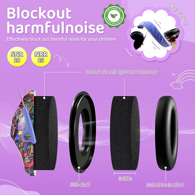 - [Supreme Comfort & Durability] Crafted with premium, skin-friendly materials, our 360° rotatable cups and ultra-soft ear cushions fully encompass your child's ears, providing long-lasting comfort. The fully padded headband offers maximum comfort, stability, and durability, reinforcing internal construction and ensuring a safe and cozy fit for kids' heads