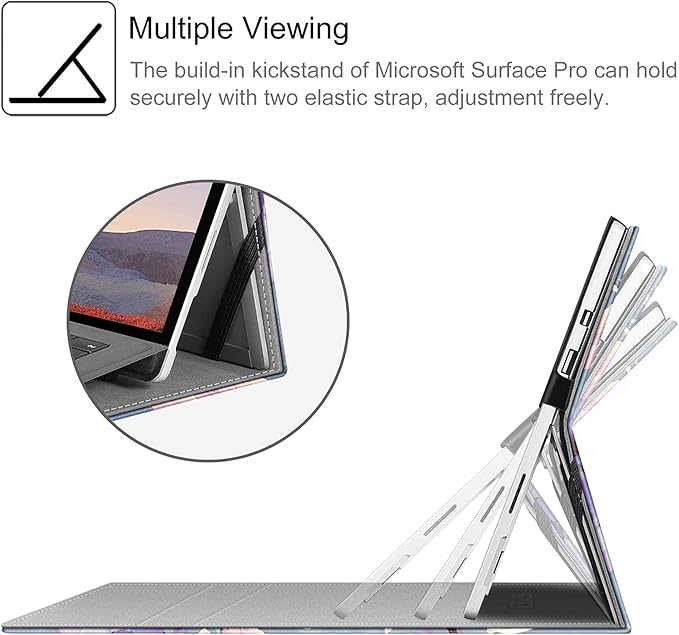 - Unique design ensures Microsoft Surface Pro original built-in kickstand to be used at will for multi-viewing angles. Extra Pocket allows to store small items such as business card or usb charging cable if in need.