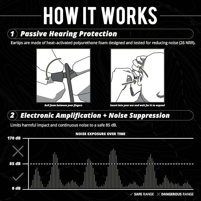 - TACTICAL SOUND CONTROL: Block impact noise with audio passthrough technology. TSC enables conversation and environmental awareness while suppressing percussive noises from gun ranges or other hunting and shooting related activities. Also features passive noise isolation of 26 dB noise reduction rate (NRR).