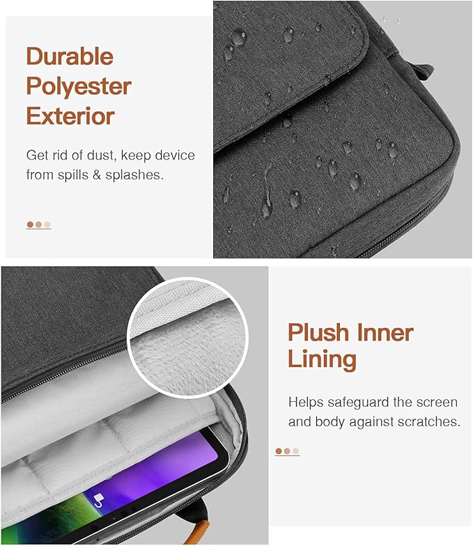- PREMIUM MATERIAL: Polyester exterior features wear-resistant against dust and splash. Thick sponge padding protects your tablet and items from shocks, collision and being squeezed. Soft inner lining prevents scratches. High-end material gives your device a superior protection.