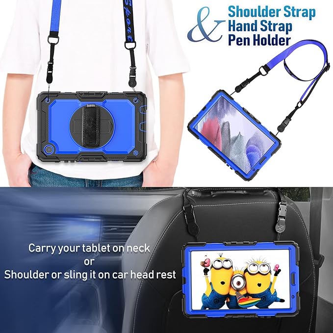 - 【Adjustable Hand/Shoulder Strap】The back turntable built-in a hand strap, when you put your hand into the strap, you can firmly grasp the center of gravity of your Galaxy Tab A7 Lite tablet. Additional adjustable shoulder strap up to 49 inches ,it can be attached to the case for carrying your device.