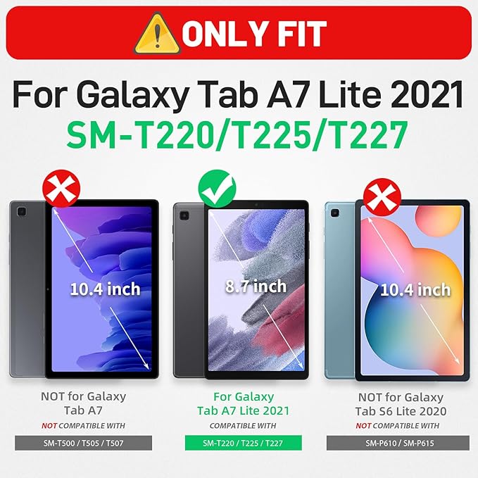 - Compatible with Tab A7 lite 8.7 inch : Only fits Samsung Galaxy Tab A7 Lite 8.7 inch 2021 released. (Model number: SM-T220, SM-T225, SM-T227) Please check the model number on your tablet "Settings" - "About" - "Model Number", NO Pen included! also you can find step by step install instruction video in our store.