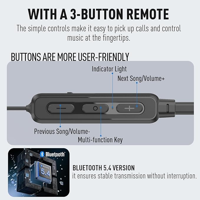 - Advanced Bluetooth V5.4 Connectivity: The earbud features the latest Bluetooth 5.4 version, it stutter-free and reliable with a good range. With a 3-button in-line remote, it lets you answer phone calls, control music, adjust volume and more very easily