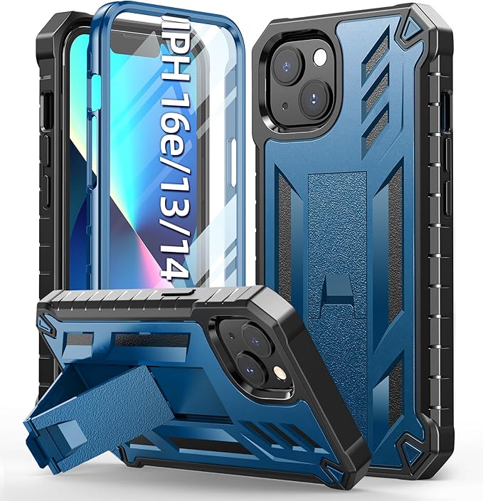 for iPhone 13/14 Protective Case: for iPhone 16e Cover with Built-in Kickstand | Heavy Duty Military Grade Hard Protection Shock Proof | Durable Dual-Layer Design Blue