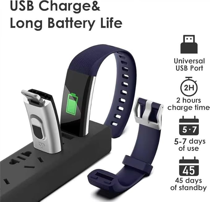 - 【USB Charge&Long Battery Life】- The fitness tracker has not extra charging cable. it is built-in USB plug, which can be charged directly on any computer and USB charger; no adapter and charging cable required. Battery capacity: 105mAh.It takes only 2 hours to charge and can be worked for 5-7 days (Noted: Both sides can be removed,but just one side with metal piece can be charged. pls plug the metal piece with charging icon into any USB port . Also,If the green charging icon isn't show on screen,turn watch to another face and plug -see below guidance picture)