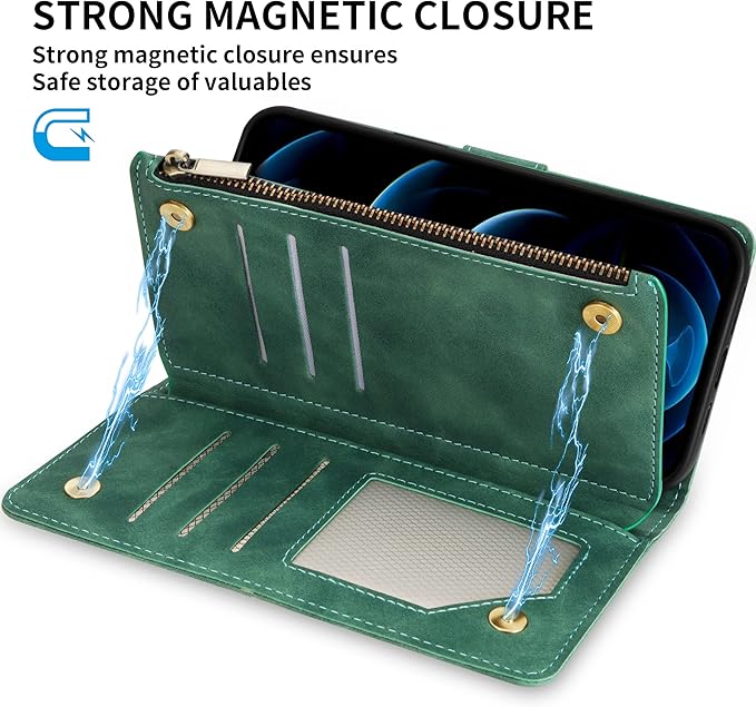 ZZXX for iPhone 12 Pro Max Wallet Case with Card Slot Premium Soft PU Leather Zipper Flip Folio Wallet with Wrist Strap Kickstand Protective for iPhone 12 Pro Max Case Wallet(Green 6.7 inch)