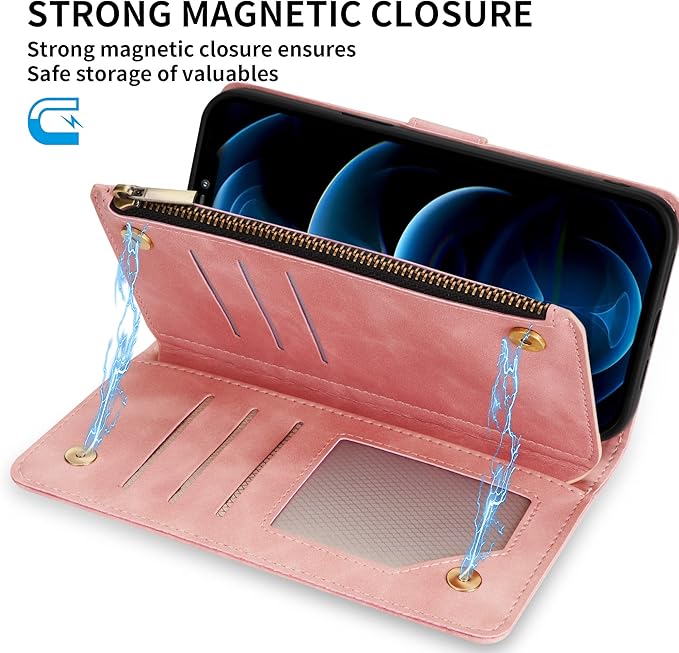 ZZXX for iPhone 12 Pro Max Wallet Case with Card Slot Premium Soft PU Leather Zipper Flip Folio Wallet with Wrist Strap Kickstand Protective Case (Pink, 6.7 inch)