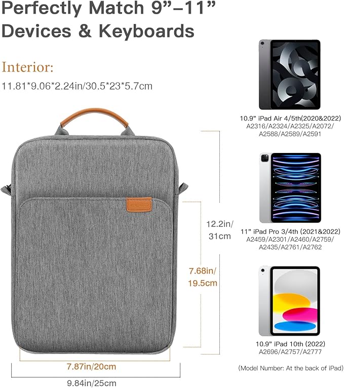 - COMPATIBILITY: The sleeve bag is designed for most 9-11 inch tablets and fits smart keyboard. Fit 11" iPad Air M3, iPad A16 2025,New 11” iPad Pro M4/iPad Air M2 2024, iPad Pro 11 M2/M1 2022/2021, iPad Air 5/4th 10.9 Gen 2022/2020, iPad 10th Gen 10.9 2022, iPad 9th/8th/7th Generation 10.2 2021/2020/2019, iPad Air (3rd Gen) 10.5 Inch 2019, iPad Pro 10.5 inch 2017, iPad 9.7 6th/5th Generation (2018/2017), iPad 1/2/3/4, iPad Air / Air 2, Surface Go 2/3 10.5, Galaxy Tab S8/S9 11".