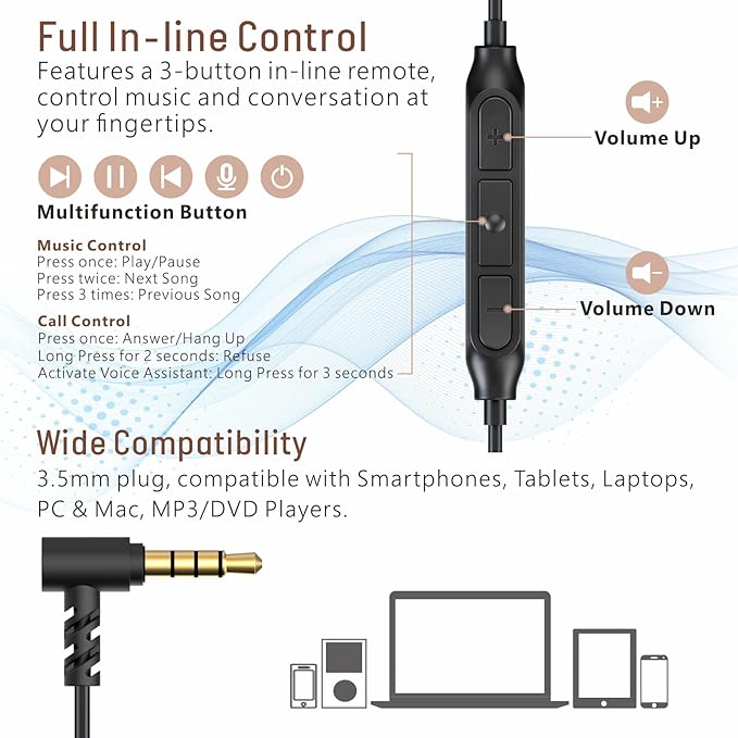 - Wide Compatibility: The universal three-button remote with a microphone lets you adjust volume, skip tracks, handle calls, and use voice controls on both iOS and Android. The 3.5mm connector works with CD players, laptops, digital audio and MP3 players