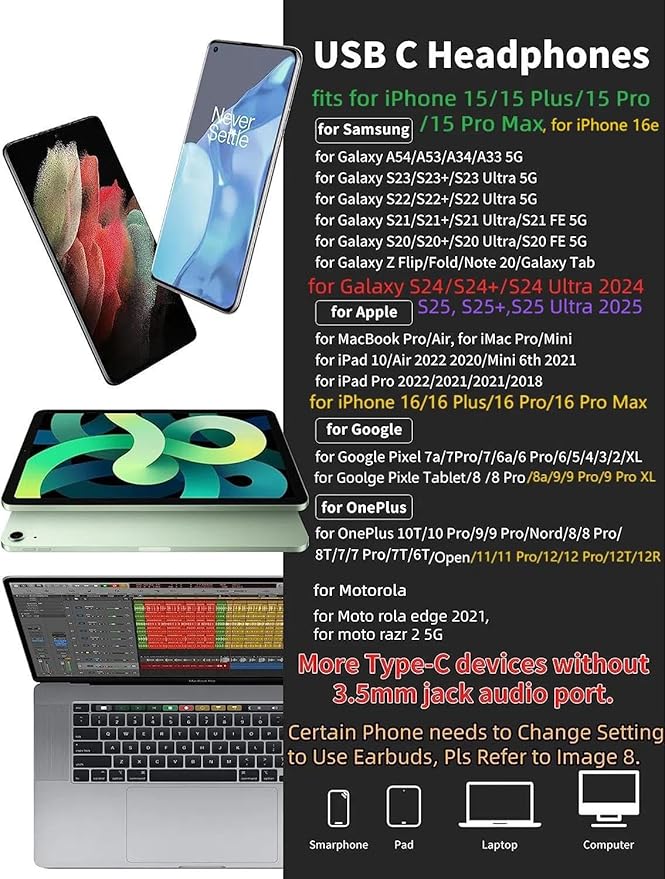 - USB C Headphone with Microphone for iPhone 17 , Air, 17 Pro, 17 Pro Max,16e,16,16 Pro,16 Plus,16 Pro Max,15,15 Plus,15 Pro,15 Pro Max,for Samsung S25,S25+,S25 Ultra,A16 A26 A36 A56,S24 FE,S24,S24+,S24 Ultra,for Google Pixel 10 Pro XL 9a 9 8a 8 7a 6a,6,Galaxy Z Flip,Fold,S23 FE,S23,A53,A54,A33,A34,S22,S21 FE,S21,S20 FE,S20,Tab S10+ Ultra,for OnePlus 13 13R 12 12R 11 10 Pro,for Macbook Pro,for iPad 10 11,for iPad Pro,Mini 6,Air 4 5 6,for motorola edge 2021,for Nothing Phone,C device without 3.5mm