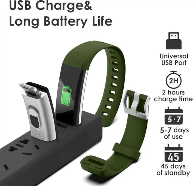 - USB Charge&Long Working time - The fitness tracker has not extra charging cable. It is a built-in USB plug, which can be charged directly on any computer and USB charger; no adapter and charging cable required. It takes only 2 hours to charge and can be worked for 5-7 days (Noted: Both sides can be removed,but just one side with metal piece can be charged. pls plug the metal piece with charging icon into any USB port . Also,If the green charging icon isn't show on screen,turn watch to another face and plug -see below guidance picture)