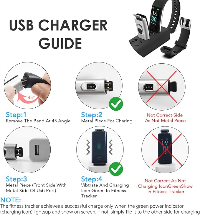 - 【Removing method for the Band of the Fitness Tracker】Please remove the band at a 45-degree angle, as shown in the charging method picture. Pulling it straight up or at the wrong angle may cause the band to break or deteriorate.