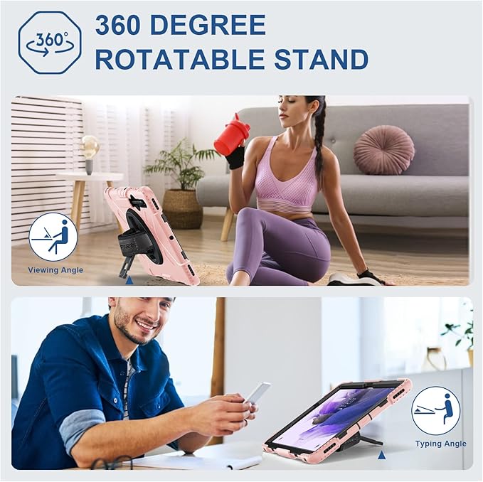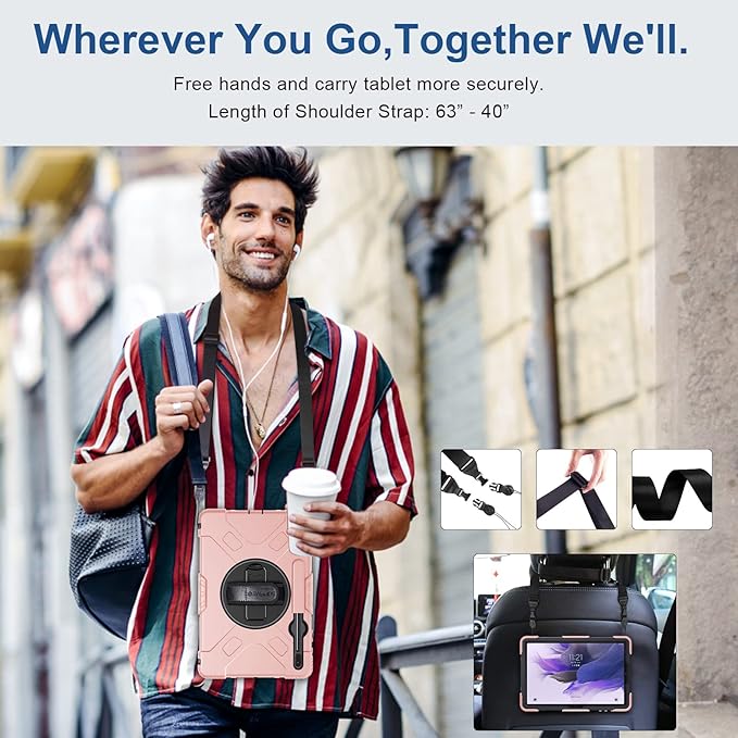 - Soft Handle Strap & Portable Shoulder Strap & Rotating Stand : 1. Soft leather fabric hand strap is adjustable and helps hold the center gravity of your tablet s7 fe 2021. 2. Nylon cross-body strap can help carrying with a more secure way during hiking, traveling and car seat. 3. 360 degree stand is convenient for your tireless hands- free vertical / horizontal watching videos, conference, movies, and games while on the go