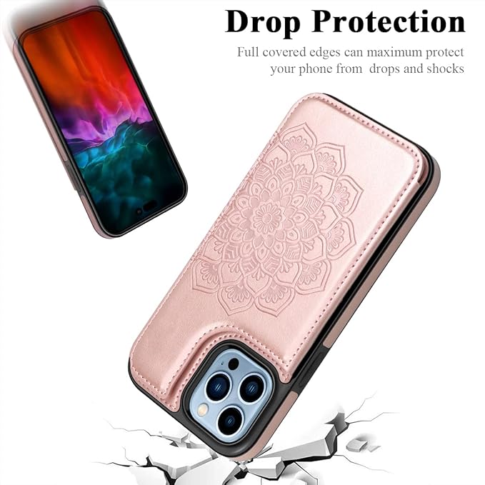 MMHUO for iPhone 14 Pro Max Case with Card Holder,Flower Magnetic Buttons Protective Wallet Case for Women for iPhone 14 Pro Max,Rose Gold