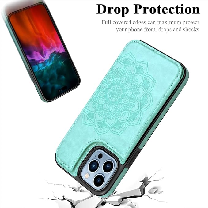 MMHUO for iPhone 14 Pro Max Case with Card Holder,Flower Magnetic Buttons Protective Wallet Case for Women for iPhone 14 Pro Max,Mint