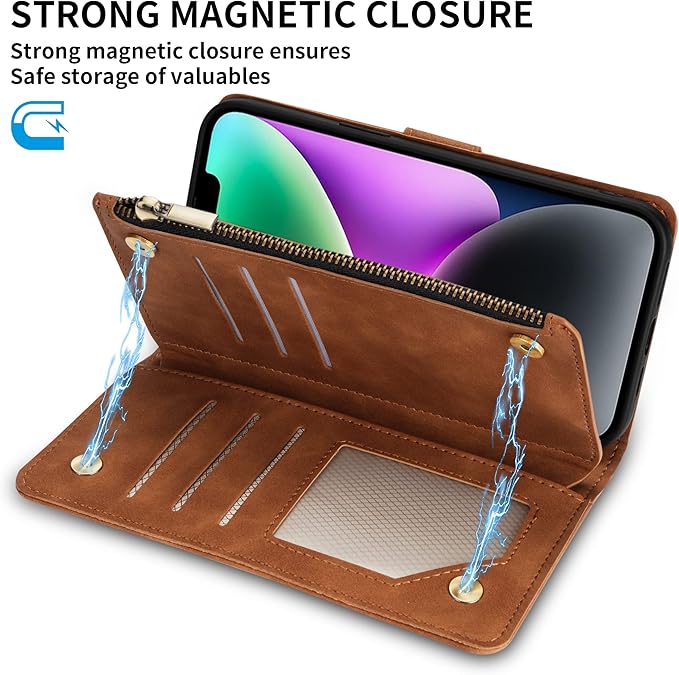ZZXX for iPhone 14 Case Wallet with [RFID Blocking] Card Slot Premium Soft PU Leather Zipper Flip Folio with Wrist Strap Kickstand Protective Phone Cover for iPhone 14 Wallet Case(Brown-6.1 inch)
