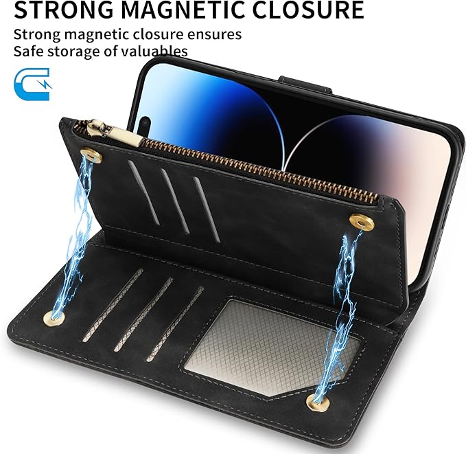 ZZXX for iPhone 14 Pro Max Case Wallet with [RFID Blocking] Card Slot Soft PU Leather Zipper Flip Folio with Wrist Strap Kickstand Protective Cover for iPhone 14 Pro Max Wallet Case(Black-6.7 inch)