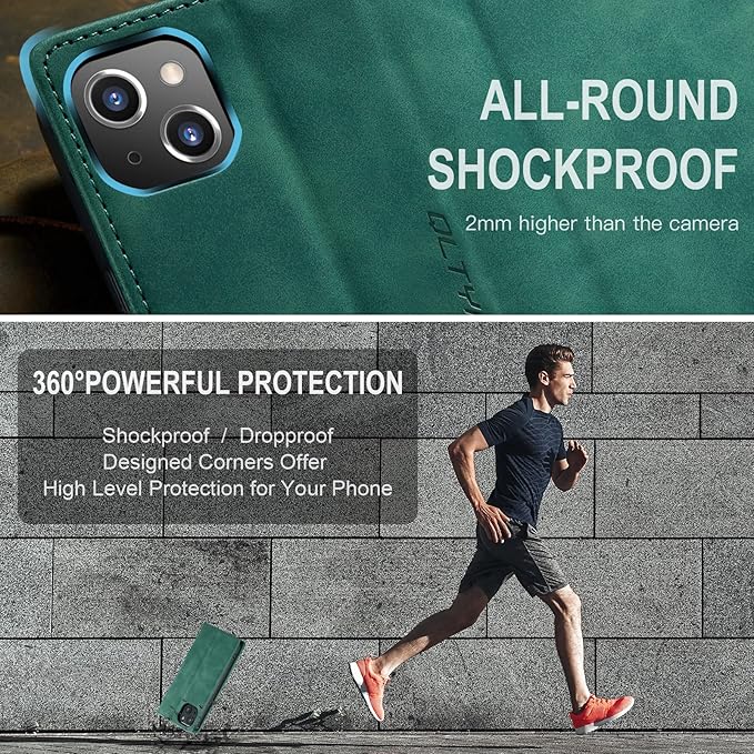 QLTYPRI Case for iPhone 14, Vintage PU Leather Wallet Case Card Slot Kickstand Magnetic Closure Shockproof Flip Folio Book Case Cover for iPhone 14(6.1 inch) - Dark Green