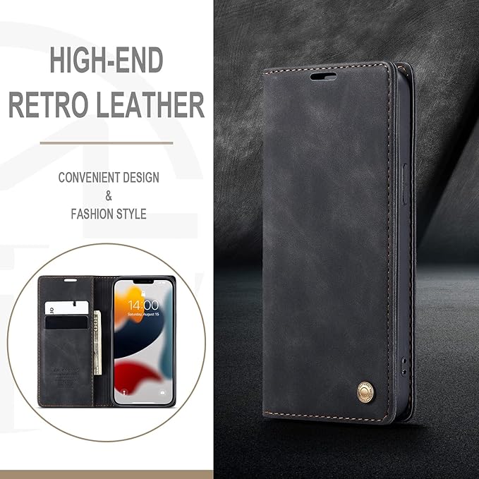 QLTYPRI Case for iPhone 14, Vintage PU Leather Wallet Case Card Slot Kickstand Magnetic Closure Shockproof Flip Folio Book Case Cover for iPhone 14(6.1 inch) - Black
