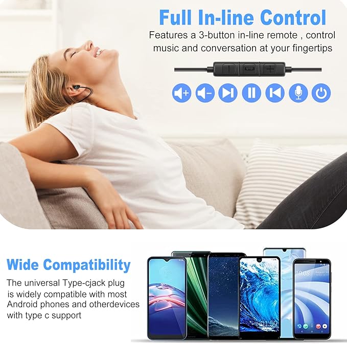 - USBUSB C sleep Headphones The headphones are ergonomically constructed with super soft silicon ear tips and will not fall even if used for an extended period of time, will not damage the ears, and will not require any further equipment. Enjoy your music with low power and App Free. Type C Headphones in Ear Earphones Earbuds with Mic and Volume Control Compatible with Google Pixel Samsung Oneplus Huawei Sony MacBook SoundFlow Black