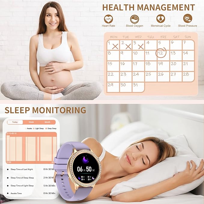 - 【Health Monitor thoughout the Day】Activate tracking for heart rate, blood pressure, SPO2 and sleep situation with a single touch. This smart watches for women cares about women's heatlth(female physiological period and pregnancy), it can also continuously monitor your activity tracking(step,calories,distance), safeguarding your health promptly. The data will be saved on the application for you to check.