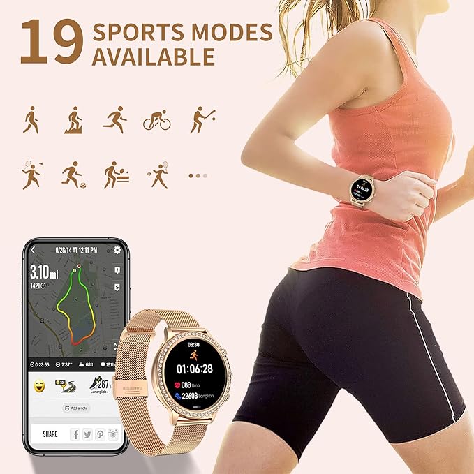 - 【Delicate & Unique Design】1.32" HD touch screen, full metal bezel set with 60 sparkling gems - zircon, will make you shine in the crowd. There are 100+ different dials and 3 starps for this smart watch, and you can also customise your style with your favourite photos.