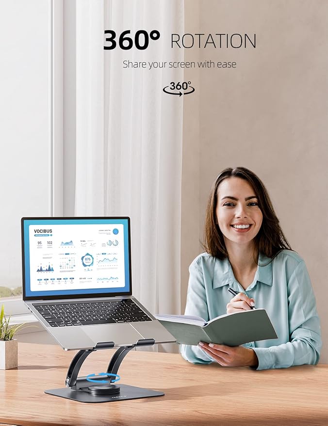 - 360 Rotation: This laptop stand lets you turn your laptop to any angle thanks to its 360° rotating axis that connects to the base. The rotating laptop stand for desk allows you to easily share your screen with someone sitting across the room or at another desk. It also works great for ideas sessions when collaborating with others over video chat or calls.