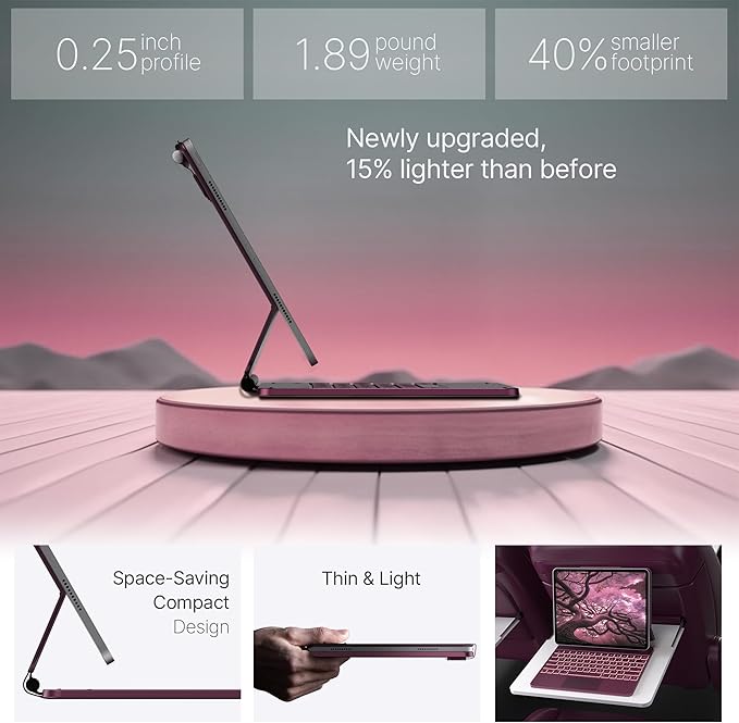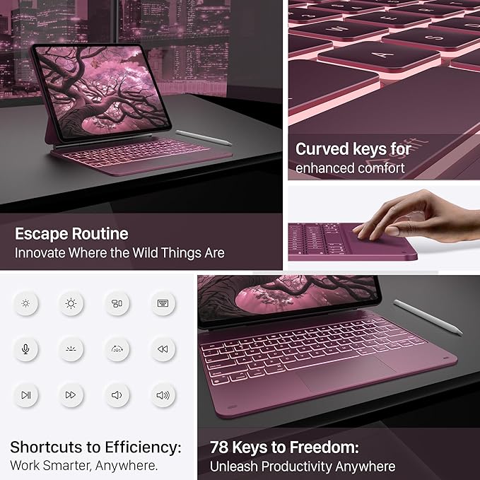 - 11-Color Backlight Keyboard with Shortcuts - Fluidly and accurately typing on the lighted 12.9 Pro case with keyboard even in a dark room, ergonomic keys, 10 colors backlight, three adjustable backlight brightness levels, give you a comfortable typing experience. No more searching around for basic functions, be more efficient with this Pro keyboard 12.9 with a full row of for PadOS shortcuts, to adjust brightness levels, change backlit colors, media, volume control, and more with one tap.