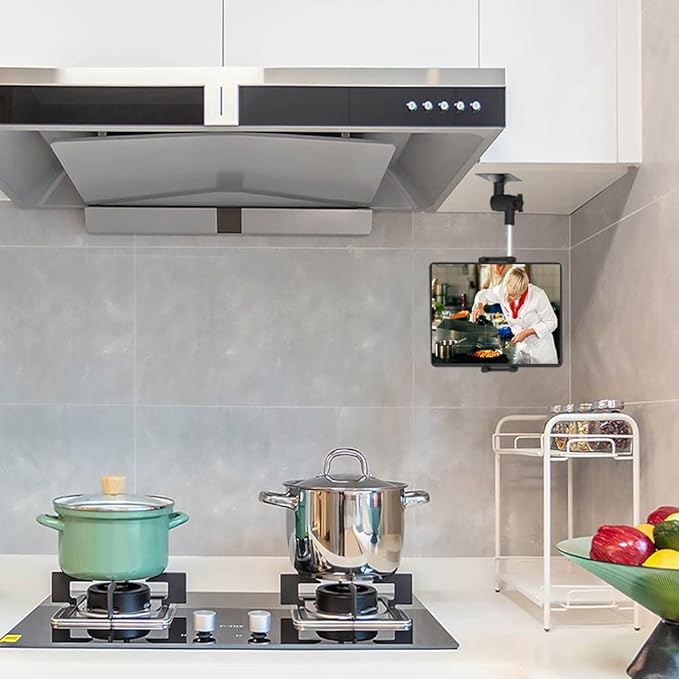 - 【Easy To Use】 Cuxwill tablet wall mount can be mounted in kitchen wall or cabinet to keep the recipes in a good visual plane; also great for the desktop(or wall) of Office, Classrooms, Medical Places, Business, Home, Gym, Retail Store, Showroom, Bedroom to watch video shows and online courses. (Kindly drill the correct holes to install the metal drill base before you place the device. Accessories with 4 screws and plastic plugs.)